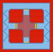 The battle stage takes place on a square platform in the middle of a sea of lava inside one of Bowser's fortresses... the backdrop suggests that it's Bowser Castle 2. Four square lava lakes lie perpendicular to each other, and they are all separated by flooring made of wire mesh. Driving over the wire illuminates players with a reddish glow and makes them go slightly slower than on normal road (So it can be slightly disadvantageous to be driving on it.)