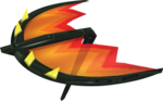 With an appearance of a blistering fire with sharp thorns, the Beast Glider does make Karts look a bit more savage when equipped with it. The cutout is a semicircle, with tattered and ripped edges. A black beam holds the wings (which are dark orange near the ends and lighten up to yellowish-orange at the base) in place, running down the middle. 4 yellow spines pointed backwards come out the top of a dark crossbeam. Instead of strings, a black pole fastens the Beast Glider to the back of the vehicle.