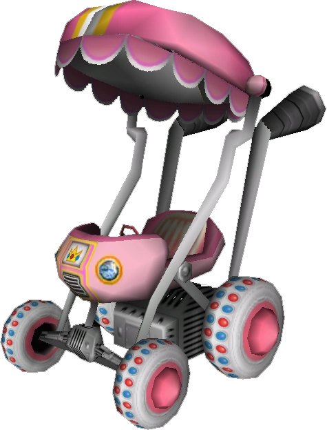 The Booster Seat is a Kart for Small racers. It is one of the three starter karts in the Small class, along with the Standard Kart S and the Mini Beast (Concerto). It is Baby Peach's signature vehicle. Its roof will flip open when the kart does a Trick or uses an equippable Item. Its bike-counterpart is the Bit Bike. Its medium and large counterparts are the Daytripper and Offroader respectively, as all three karts have the best handling among all karts in their respective size classes but are the slowest karts in their respective size classes.