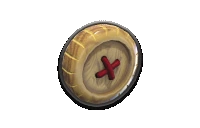 They look like light brown buttons with distinctive red yarn forming an "X" in the center.