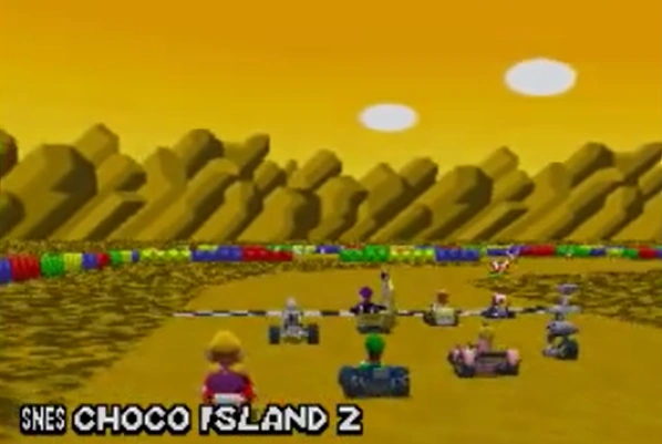 Choco Island 2 is the second of the five Tracks of the Star Cup in Super Mario Kart, the last track of the Extra Lightning Cup in Mario Kart: Super Circuit, and the first track of the Lightning Cup in Mario Kart DS. This track then appeared in Mario Kart Tour, first appearing as part of the Tokyo Tour. It is set to return again in Mario Kart World, located just outside N64 Choco Mountain, a course with a similar theme, though it is unknown if it will be selectable from the menu.