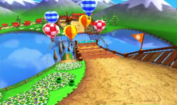 It starts off in a small village. A path leads to some bridges, ascends to a hill with some Mountain Goats (which behave in a similar fashion to Moo Moos). After another bridge, the player can choose can choose to go on a jump to fly the village or to a shortcut to fly through windmills. Going on the normal path, it is possible to land on the row of houses for some boosts.