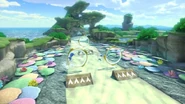 When the two paths meet, there is a Dash Panel ramp where players jump over along with more water bubble pipes, with a giant Unagi in front of it. Players can drive over the it's body, where coins appear at the tip of it. If players fall they can just drive under it during the section. After that, players activate the anti-gravity mode and jump off a ramp out of the cave and goes to a platform held with rocks that is tilted almost sideways. There is another ramp on the track after which there is a gliding section. Players fly over a water rapid then land back on the track where there are a few more turns, going back underwater and leading to the Finish Line.