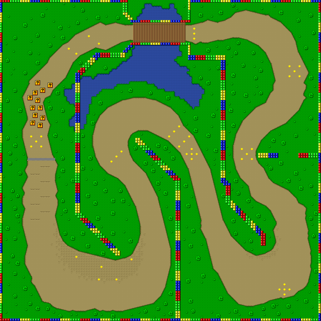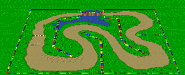 This is the second course of the Mushroom Cup in Super Mario Kart. It is a round track with a bridge after the first turn. There is also a shortcut after the second turn. The track contains a section of bumpy road that slows karts down. There is actually a pond that you can fall into and the grass barely slows you down.