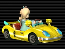 The Honeycoupe (also known as Dragonetti in Europe) is a heavy Kart in Mario Kart Wii. It can be unlocked by finishing the 150cc Lightning Cup in the first place or by playing 3,000 races. It is a very heavy kart with great speed, drift, and mini-turbo, but its off-road is very low, and its handling and acceleration are also poor. Resembling an old Porsche, the kart has headlights in the front, rear-view mirrors, and even a license plate with the character's emblem. When Rosalina is driving the Honeycoupe, it strongly resembles the Parade Kart from Mario Kart: Double Dash!! When Wario is driving the Honeycoupe, it strongly resembles the Wario Car from Mario Kart: Double Dash!!. As you can see, it's based on a bee.