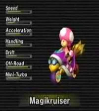 The Magikruiser is a lightweight Bike in Mario Kart Wii. It is unlocked by completing Time Trials on any eight different tracks or by playing 900 races. Its design is based on the Magikoopa, a flying, magical Koopa enemy in the Super Mario series. It has decent acceleration, speed, handling, and mini-turbos, as well as the best off-road in the game (reaching its highest with its driver being Toadette), but its low weight allows players riding it to be pushed around more easily. Therefore, it is able to take Off-Road shortcuts without losing much Speed, but loses much of its effectiveness on stages with barely any off-road sections. It is considered to be an excellent beginner's bike and a solid lightweight bike in general. Its kart-counterpart is the Tiny Titan.