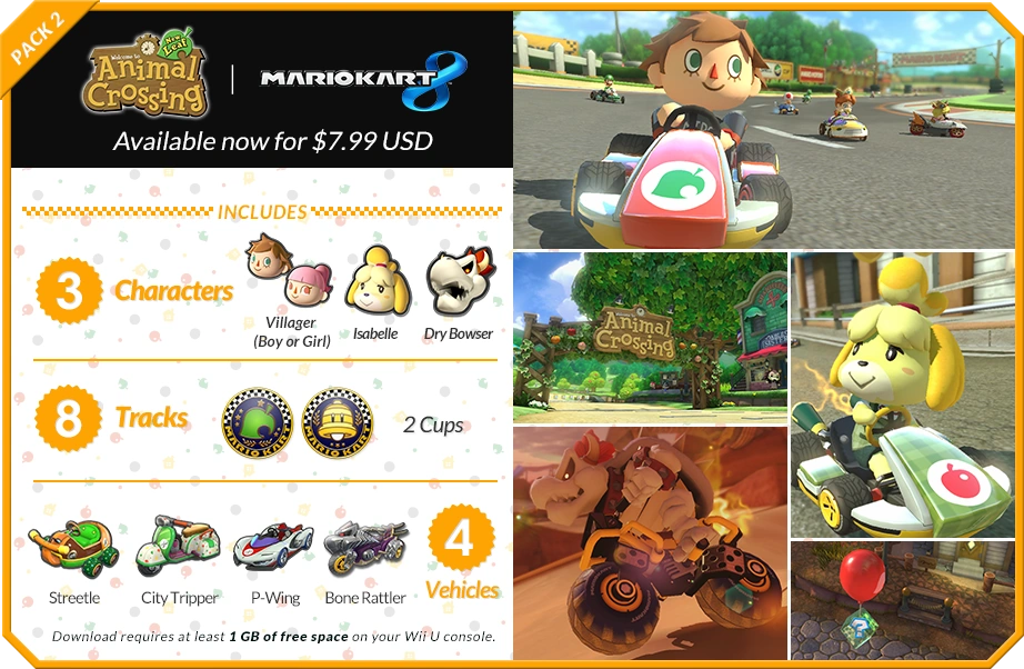 - Animal Crossing × Mario Kart 8 (Pack 2): US$7.99, CA$9.99 or 400 My Nintendo platinum points
