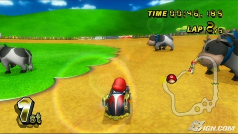 Moo Moos appear in Mario Kart 64, in the level Moo Moo Farm. Here, they do not go on the track at all, instead staying behind the fence. They actually have no animation, just face-me models that look like cows. However, they can be heard mooing. Moo Moo Farm also appears in Mario Kart DS, in which Moo Moos would gain bells.