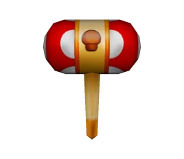 The Mushroom Hammer(キノコハンマー) is a large mushroom-studded hammer that Toad can exclusively use in Mario Kart Arcade GP and its successor. A combination between an ordinary Hammer Item and turbo-boosting Mushrooms, this Special Item when wielded can do massive damage when it's on the track.