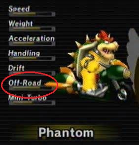Off-Road is a statistic in Mario Kart Wii and Mario Kart 7. It determines how fast a Kart/Bike goes if not on the track. Off-Road is anywhere that is not on the main road (grass, sand, mud, etc.) but is not out of bounds. In other Mario Kart games, Off-road is determined by the Acceleration stat.