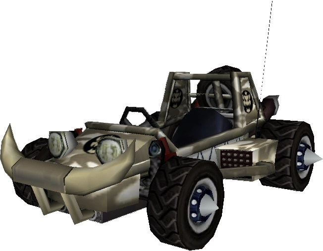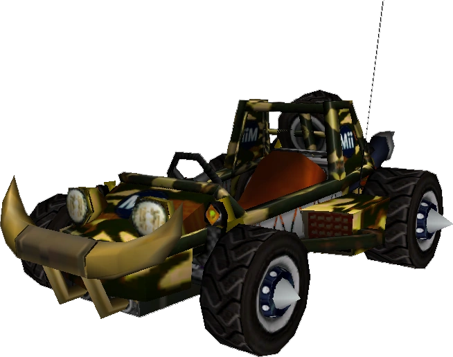 The Offroader's design is based on a Sandrail in a camouflage pattern. It bears characteristics to make it a tough-looking kart, such as its front frame, with ends like bull horns, which is attached by two metal bars. The front of the body has two circular headlights that stick out. On the sides, it has a razor-shape pattern, along with a side platform, where the platform on the right holds tall pole with a colored flag at the end. In the cockpit is a tall seat with two walls aside it which hold the character's emblem. Behind it is a large tire, with two exhaust pipes aside it. It has 4 large wheels that have spiky rims, which are joined to the kart via springs.