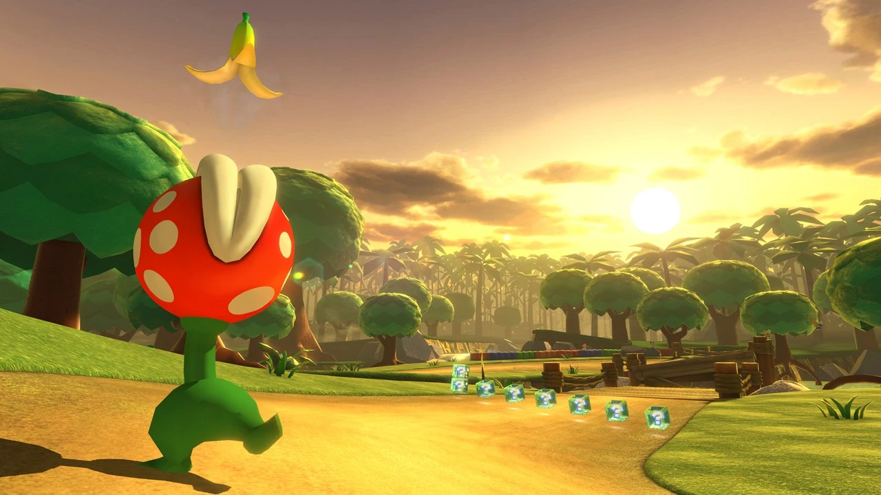 Ptooie propelling a Banana in the air on the Mario Kart 8 Deluxe version of Riverside Park.