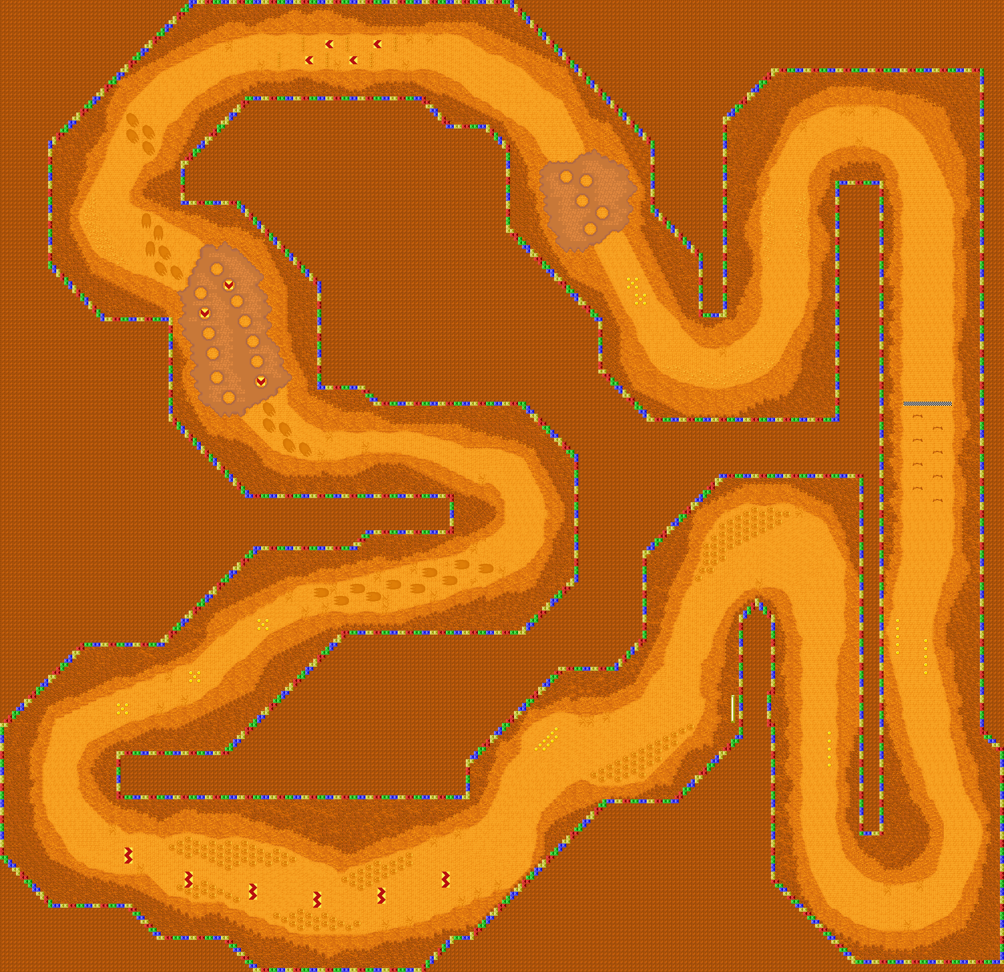 Racers start with a long straighaway, which is before a left u-turn. This leads to a short straightaway with a right 135-degree turn at the end. This takes racers into a large mud patch that slows them down. After the mud patch is a short left turn, followed by a straightaway. This finishes off with a wide left turn, and there is another mud patch, which is even longer than the last. After this mud patch is a short left turn, followed by a right u-turn shortly after. This leads to a wobbly straightaway, which ends off with a left u-turn.
