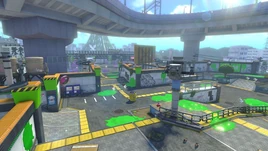 Urchin Underpass is one of the bigger arenas. Huge stone pillars on the corners of the arena hold up a roof made out of glass, and around the field are huge rectangular holes. A few trees dot the place, and Urchin Underpass seems to have undergone an ink firefight as huge splotches of green and purple ink dot the place.