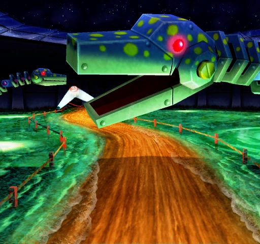 This track takes place in the same location in Stadium Arena, but has a different route. Racers start in a dirt section of the track with high bumps, which then leads to a pit with green liquid and robotic dinosaurs. After this green pit is a chain ramp that leads to the top of the course. This road eventually leads racers back to the starting line. Just as Stadium Arena, this course has many robotic dinosaurs in it.