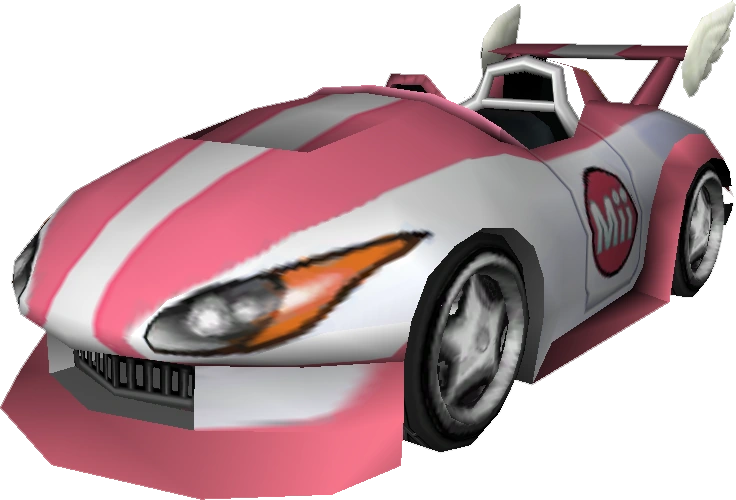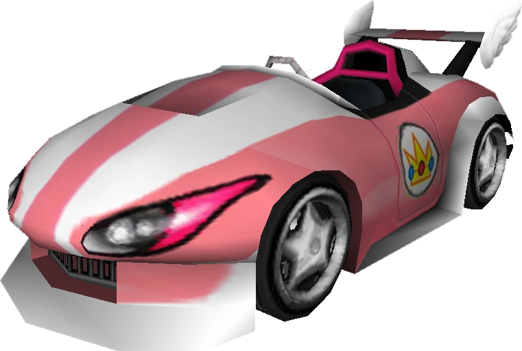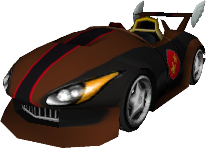 The Wild Wing takes the look of a round, sporty tuner car with an aerodynamic front, looking more like a McLaren F1 LM, which features sharp-looking headlights, which could be based on an Oldsmobile Intrigue. The front of the body bears a wide stripe followed by a narrow stripe in the middle, as well as having fenders on the bottom of the kart and under the wheels. In the cockpit is a sporty and comfortable seat, and behind it is a wide spoiler with Mario-style wings as its tips. It has a rear that bears resemblance to a Toyota Supra Mark IV, with an exhaust system consisting of two dual exhausts.